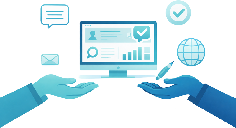 Gute Ergebnisse entstehen im Dialog. Deshalb beziehen wir Sie während des gesamten Projekts aktiv ein. Durch regelmäßigen Austausch und gemeinsame Abstimmung entwickeln wir Schritt für Schritt eine Website, die zu Ihren Inhalten, Zielen und Ihrer Marke passt.