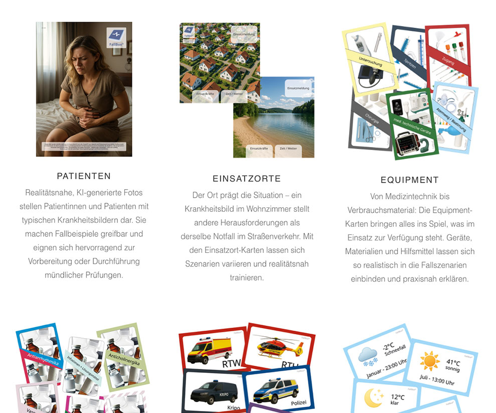 Die FallBox® ist ein innovatives Lehr- und Trainingskonzept, das für die Aus- und Fortbildung in Medizin und Gesundheitsberufen entwickelt wurde. Sie kombiniert realitätsnahe Fallbeispiele, thematische Karten-Sets und praxisnahes Equipment zu einem flexiblen und interaktiven Lernsystem.